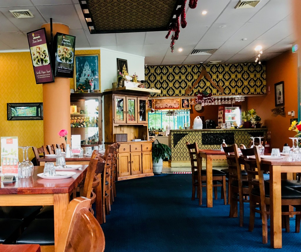 Thai Ayutthaya is a large restaurant on the lake. Two of the walls are painted bright orange and the other two, are floor to ceiling windows looking out on to the trees and path next to the lake. It looked as if there was seating outside, however the chairs were stacked up and the area looked a bit worse for wear with weeds and flaking paint along the rails – I’d guess its dilapidated state was a result of lack of use during Covid, although with the warmer weather, I think they’re missing out by not using the space.