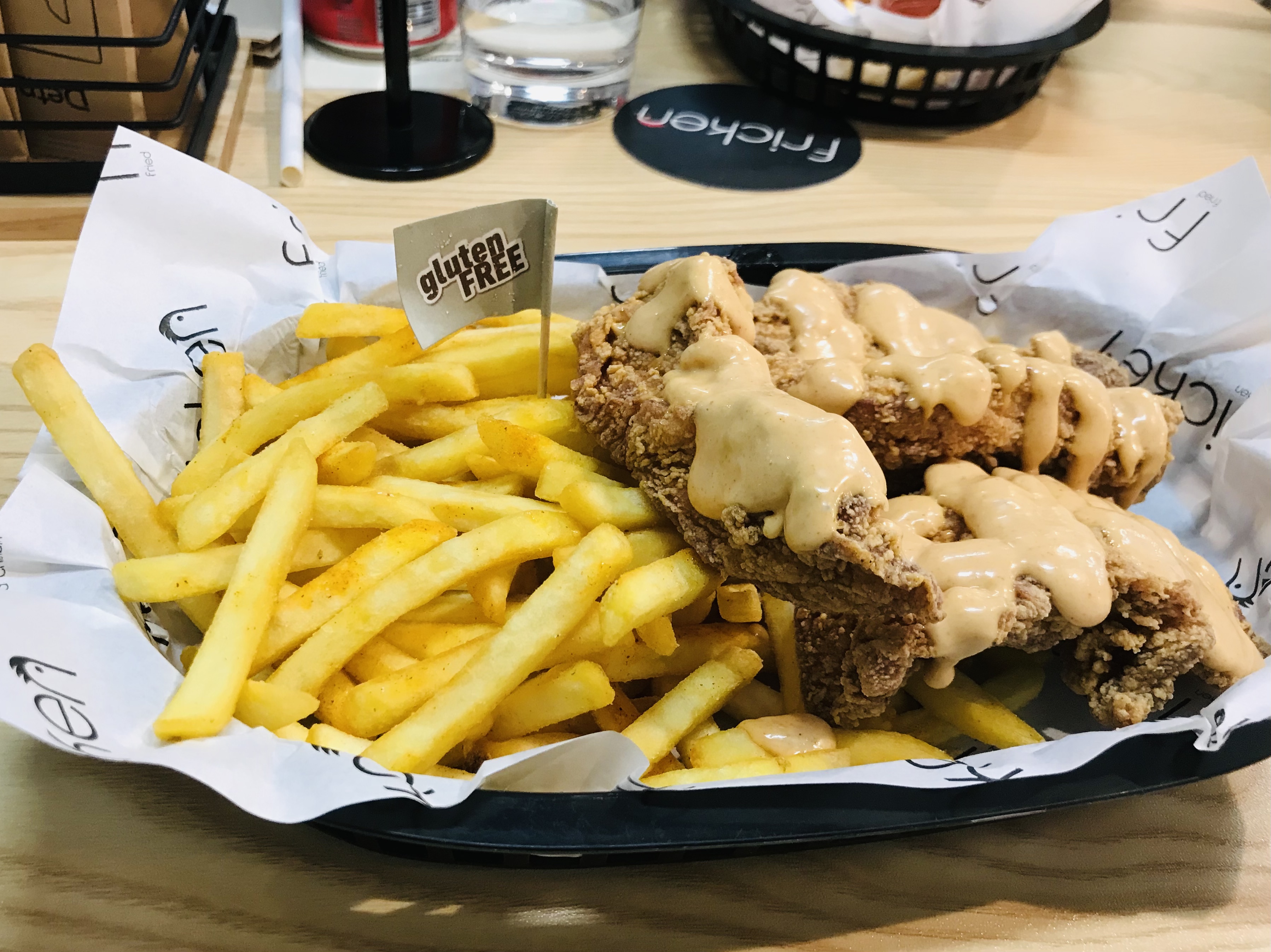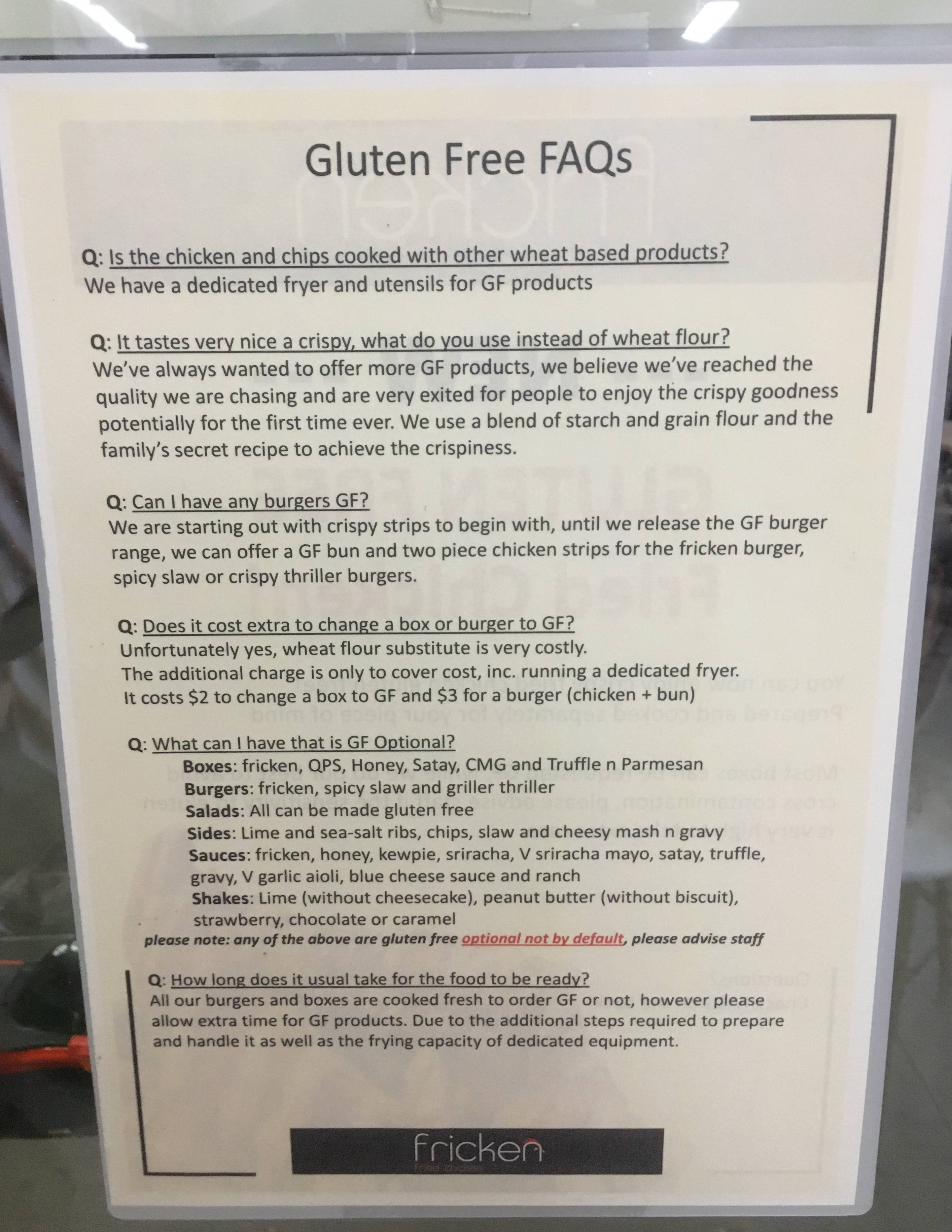 The menu is well labelled with what is available gluten free and dotted around were posters with their gluten free FAQs. The info outlined included the crumb used for the gluten free chicken, made from starch, a grain flour and the Fricken secret recipe, some info on their dedicated fryer and utensils, info on the pricing, and ordering options. A lot of the menu can be made gluten free and there’s the added benefit that they also have a couple of children’s meals.