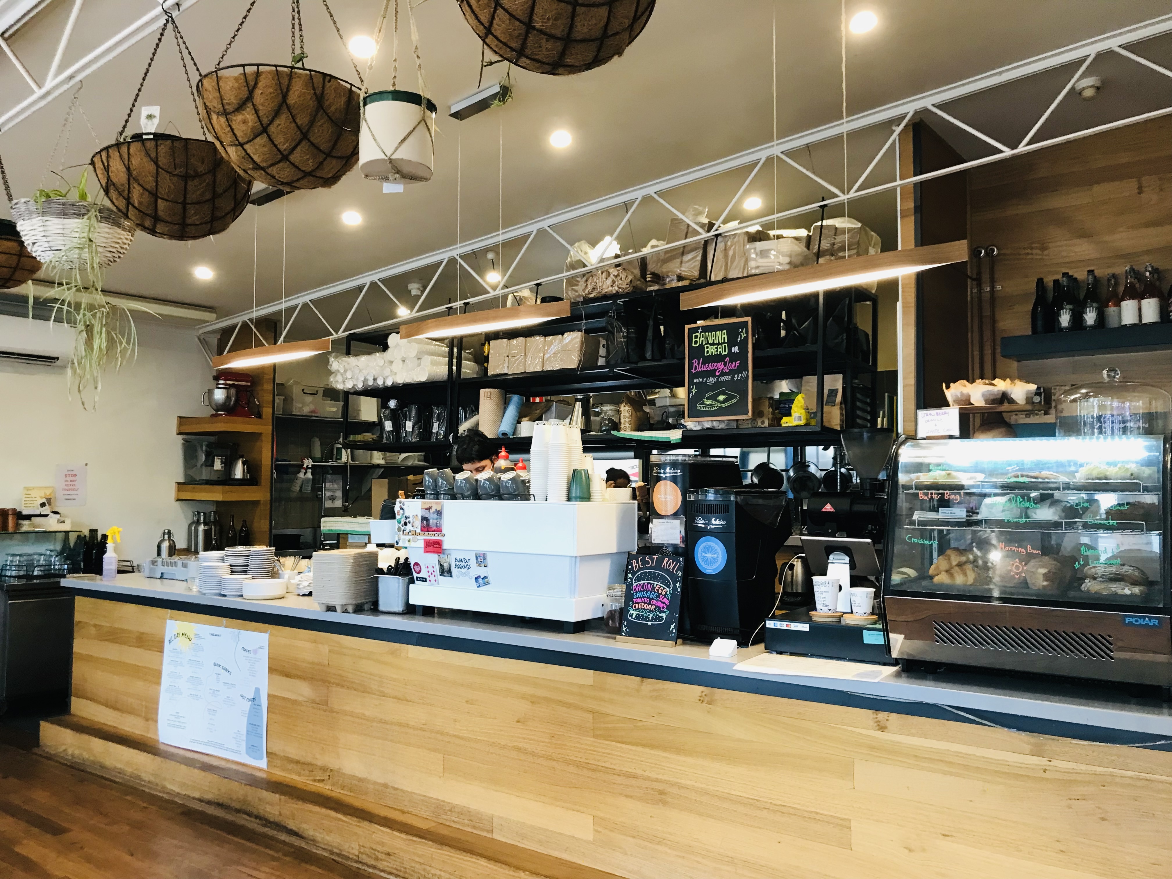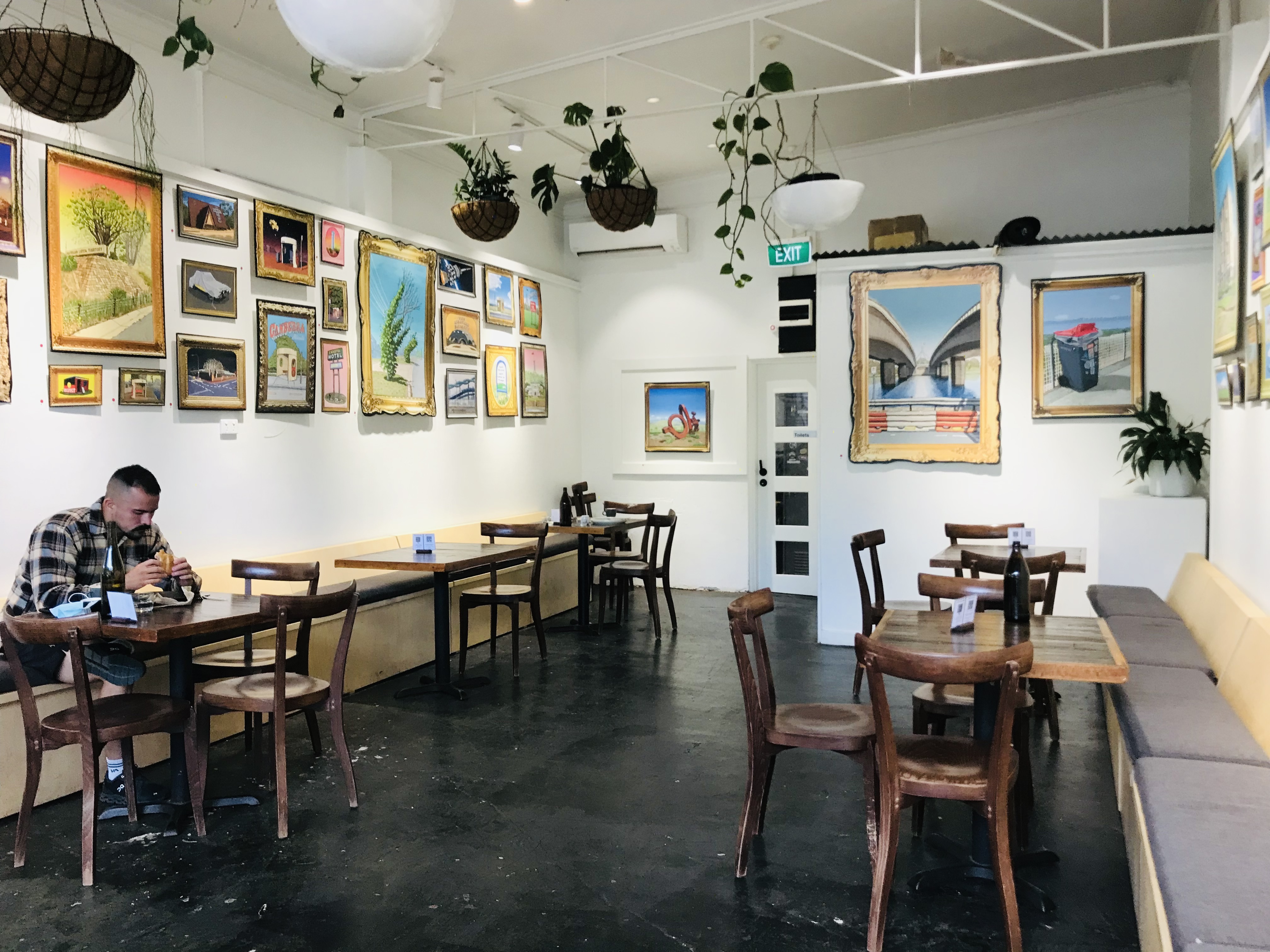 We reached Lyneham around 10am and parked around the back of the Lyneham shops. It was midweek during the school holidays and parking was surprisingly easy, as it can be quite difficult to get parks. We walked round and went into the Front. You can’t see the café from the street because there is a wall of potted plants hiding the view. Behind the plants there are tables and chairs outside. Inside, the space is split into two rooms, the gallery and the coffee shop. In the gallery, the walls were painted white with black concrete floors, and there’s lots of art work up on the walls. When we visited, we caught the last day of Fresh Canberra Classics – New Works by Trevor Dickinson – the artist responsible for the iconic Clem Cummings bus shelter prints. The walls were covered in prints of Canberra landmarks and I loved it! There were wooden tables and chairs set out and it was very relaxed and comfortable. The coffee shop section has the same laid-back feel. The floor and coffee counter were wooden and there were plants hanging from the ceiling. The counter itself was strewn with coffee paraphernalia and in the back was a bustling kitchen.