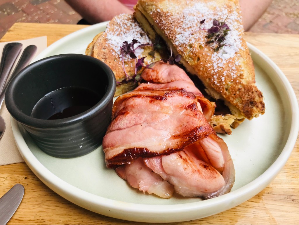 Our food came out promptly and it all looked really good, the French toast portion was very generous with a large piccoli chocolate brioche sandwich and loads of bacon and maple syrup. The combination of bacon with the bitter-sweet dark chocolate was odd, and Michael wasn’t keen on eating the bacon with the French toast, only nibbling a little of it at the end. Some fruit or cream would have complimented the chocolate in the French toast better, or adding something sweet like maple syrup to balance the bacon. The brioche was thickly sliced and nicely cooked, so it wasn’t too eggy, and the piccolo chocolate was a nice and dark, not too bitter or too sweet.