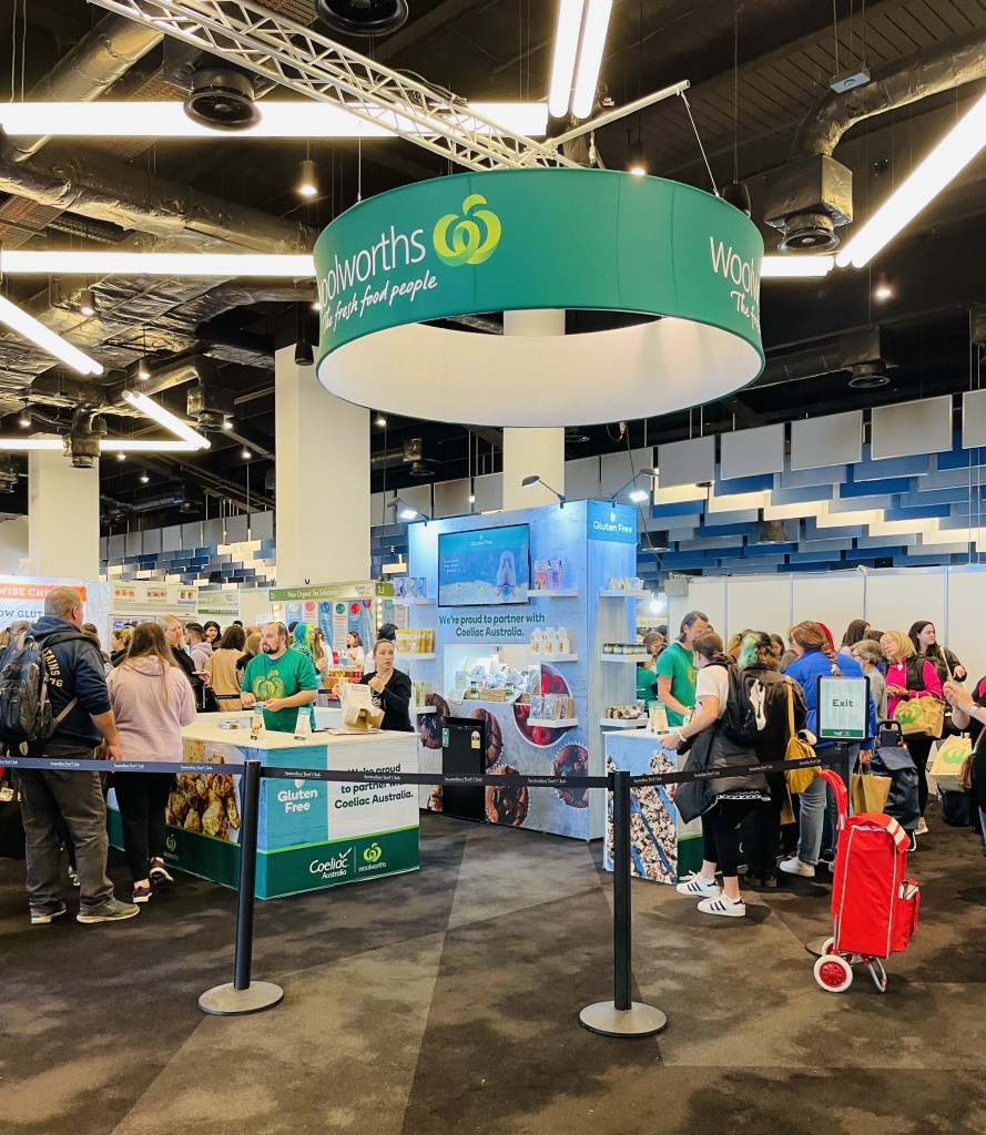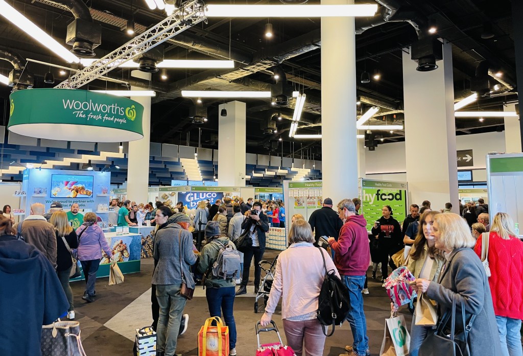 In pride of place directly in front of the entrance was the Woolworths stand. This was the first year with Woolies at the expo so I had high expectations that there would be some cool stuff going on – previous expo’s with Coles had cooking classes, some of the Masterchef contestants, and lots of things for sale. So I was disappointed with the Woolies stand. It was small and there were two women giving out samples of chocolate covered scotch fingers (yummy) and some whole food balls (not so yummy) plus a long queue to enter a draw for a hamper of Woolies goodies. That was all. It was pretty lame.